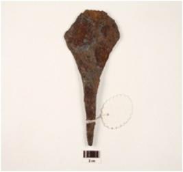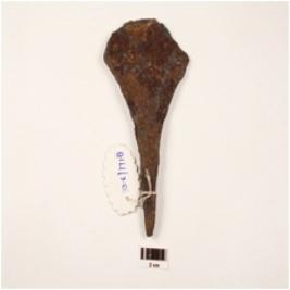 | Description / विवरण | A chisel made on iron sharp and broad edges, pointed on one side rusted surface. |