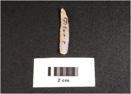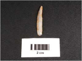 | Description / विवरण | Microlithic blade on chalcedony with prominent mid-ridge on dorsal, triangular in section, use wear marks along the cutting edges, bulb on proximal end. |