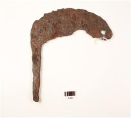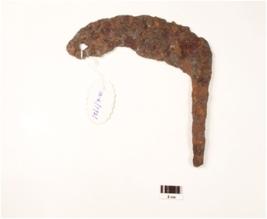 | Description / विवरण | A sickle made on iron curved and sharp on one end and pointed on other end, rusted surface. |