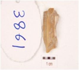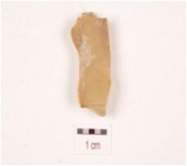 | Description / विवरण | A chert made on utilized side struck flake, flake scars on the dorsal surface, prominent bulb on the ventral side, prepared platform and use wear marks on the cutting edges. |