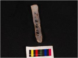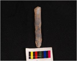 | Description / विवरण | Parallel sided microlith blade with double ridge on dorsal and use wear marks on cutting edges. |