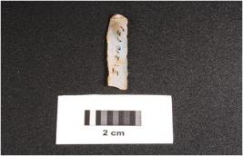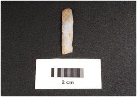 | Description / विवरण | Microlithic blade on chalcedony with prominent double ridge on dorsal, trepezoidal in section, use wear mark along the cutting edges, bulb on proximal end. |