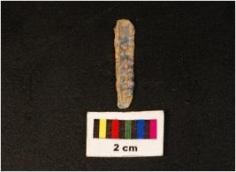 | Description / विवरण | Parallel sided blade with use wear marks on cutting edges and prominent mid ridge on dorsal, prominent bulb on proximal end, triangular section. |