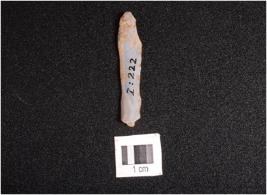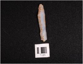 | Description / विवरण | Parallel sided microlithic blade with two ridges on dorsal side, diffused bulb on ventral side, trapezoidal in section and broken at distal end. |