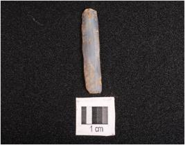 | Description / विवरण | Parallel sided microlithic blade with two ridges on dorsal side, trapezoidal in section, broken at distal end and diffused bulb on ventral side. |