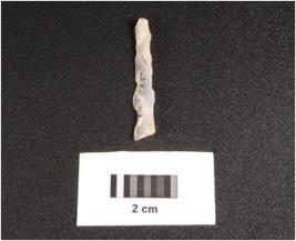 | Description / विवरण | Microlithic blade on chalcedony with prominent wavy ridge on dorsal, triangular in section, use wear marks along the cutting edges, diffused bulb. |
