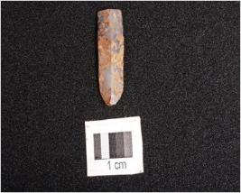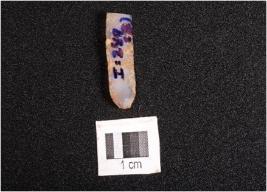 | Description / विवरण | Parallel sided microlithic blade with a prominent mid ridge on dorsal side, diffused bulb on ventral side, use wear marks on cutting edges and triangular in section. |