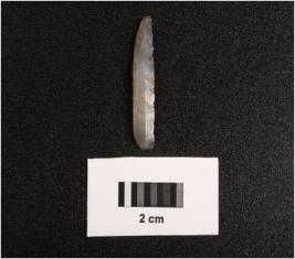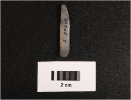 | Description / विवरण | Paralled sided chalcedony blade with two ridge on dorsal. Flat ventral side, irregular edges, distal end. |