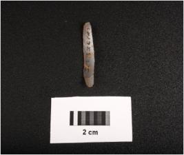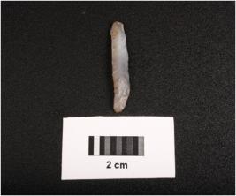 | Description / विवरण | Microlithic blade with prominent mid ridge on dorsal. Triangular in section and use wear marks on cutting edges. Diffused bulb on proximal end. |