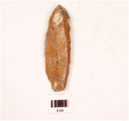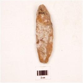 | Description / विवरण | A side scraper made on chert, mid ridge on dorsal side, use wear marks on edges glossy surface, diffused bulb on ventral side. |