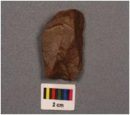 | Description / विवरण | A side scraper detached from end struck flake, prepared, platform, bulb on ventral side and irregular retouch on the right cutting edge. |