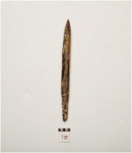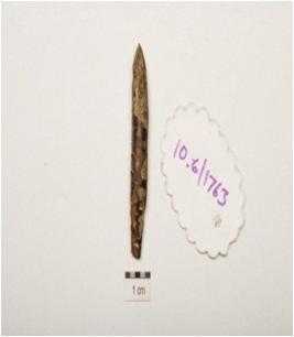 | Description / विवरण | A point made on bone with polished surface, broad at centre, pointed towards both ends, slightly broken at one pointed end, circular in section. |