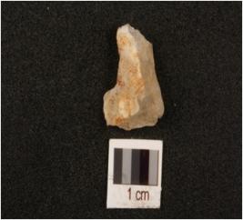 | Description / विवरण | Quartz flake with flake scars on surface and cortex on other side. |