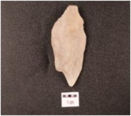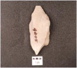 | Description / विवरण | A chert end struck flake, prepared platform and prominent bulb on ventral side. |