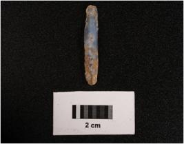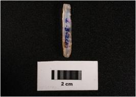 | Description / विवरण | Parallel sided microlithic blade with two ridges on dorsal side, diffused bulb on ventral side and use wear marks on cutting edges. |