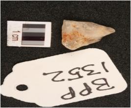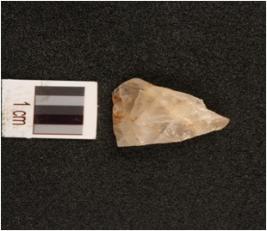 | Description / विवरण | Quartz scraper with irregular use wear marks along the cutting edges and prepared platform. |