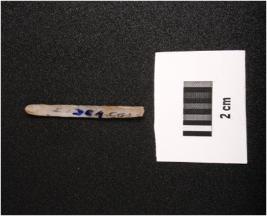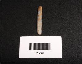 | Description / विवरण | Parallel sided microlithic blade with double ridges on dorsal. Diffused bulb on proximal end and trapezoid in section. Broken at distal end and use wear marks at cutting edges. |