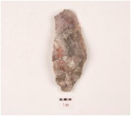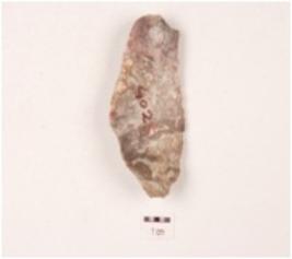 | Description / विवरण | A chert blade with prepared platform, prominent bulb on ventral side, distal end partly broken and use-wear marks along the cutting edges. |