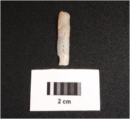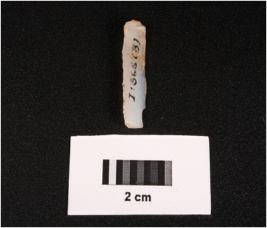| Description / विवरण | Parallel sided microlithic blade with prominent mid ridge on dorsal and triangular in section. Use wear marks and partly chipped off cutting edges. |