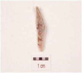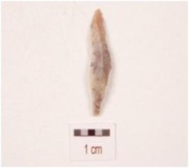 | Description / विवरण | A chert blade with triangular cross section, broken from the proximal end and use-wear marks along the cutting edges. |