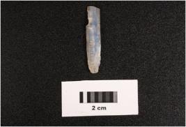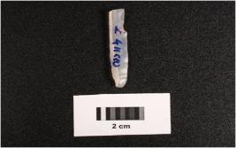 | Description / विवरण | Parallel sided microlithic blade with 3 ridges and ripple marks on dorsal side, diffused bulb on ventra side, use wear marks on edges, broken from one cutting edge and distal end. |