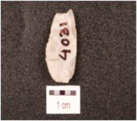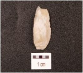 | Description / विवरण | A chalcedony blade with trapezoidal cross section, prepared platform, diffused bulb on ventral side, distal end broken and use-wear marks along the cutting edges. |