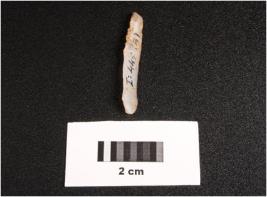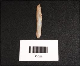 | Description / विवरण | Microlithic blade on chalcedony with prominent wavy mid ridge on dorsal. Triangular in section and use wear marks on cutting edges. Diffused bulb on proximal end. |