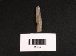 | Description / विवरण | Parallel sided microlith blade with use wear cutting marks on cutting edges and prominent mid ridge on dorsal, diffused bulb on proximal end. |