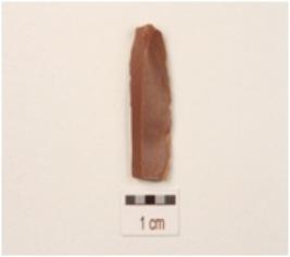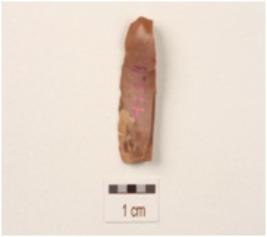 | Description / विवरण | A blade made on chert with a single ridge, bulb on the ventral side, use wear marks on the cutting edge, smooth surface and triangular in section. |