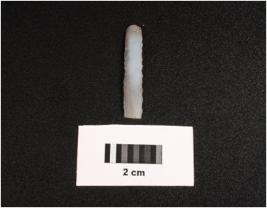 | Description / विवरण | Parallel sided microlithic blade with double ridge on dorsal and trapezoid in section. Use wear marks on cutting edges. |