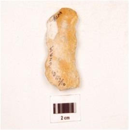 | Description / विवरण | A side scraper made on chert, uneven in shape, use wear marks on edges, flake scars on dorsal side, diffused bulb on ventral side. |