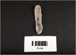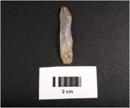 | Description / विवरण | Microlithic blade with improminent double ridge and flake scars on dorsal. Use wear marks on cutting edges and diffused bulb on proximal end. |