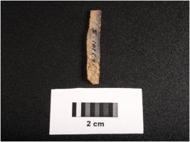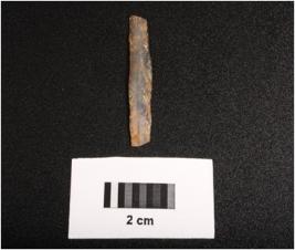 | Description / विवरण | Parallel sided microlithic blade with prominent mid ridge on dorsal. Triangular in section and use wear marks on cutting edges. |