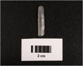 | Description / विवरण | Microlithic blade on chalcedony, two ridge on dorsal, flat ventral, irregular edges. |