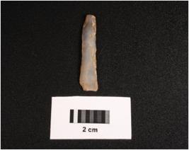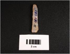 | Description / विवरण | Parallel sided microlith blade with two riges on dorsal side, prominent bulb on proximal end, it has trapezoid section, use wear marks on cutting edges. |