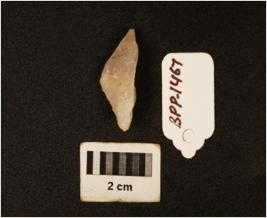 | Description / विवरण | A quartz flake with use wear mark along one side. |