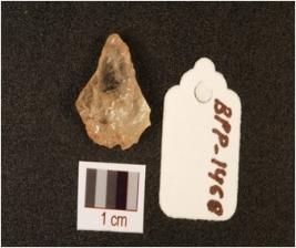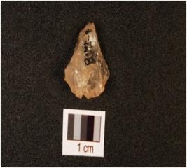 | Description / विवरण | A quartz flake, triangular shape, pointed distal end retouch and cutting edges. |