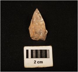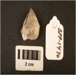 | Description / विवरण | A quartz flake with flake scars on surface. |