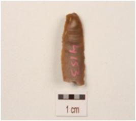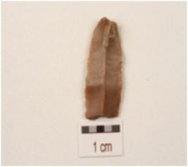 | Description / विवरण | A blade made on chert with single ridge, bulb on the ventral side, use-wear marks on cutting edges and triangular in section. |