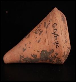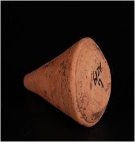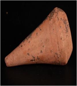 | Description / विवरण | Handmade terracotta cone, circular top and tip is pointed in shape. Surface is decorated with incised design and slip treatment was given in red colour. |