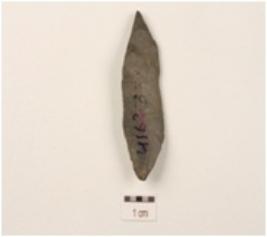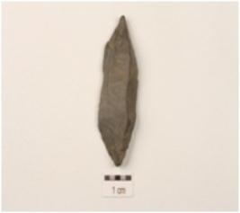 | Description / विवरण | A blade made on chert with a single ridge, diffused bulb on ventral side, pointed at both ends and use-wear marks at cutting edge. |