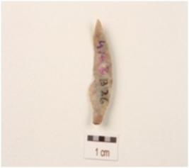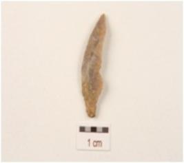 | Description / विवरण | A blade made on chert with a single ridge, use-wear marks on cutting edge, pointed at distal end and triangular in section. |