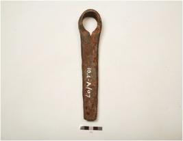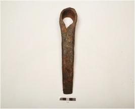 | Description / विवरण | A pick axe kudal made on iron with a shaft hole, rusted surface, flat broad edged at one end, long body, rectangular in section. |