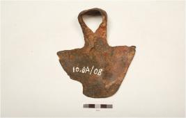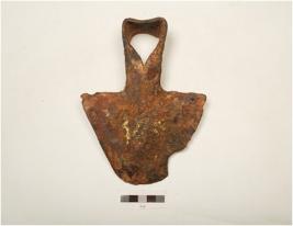 | Description / विवरण | A pick axe made on iron with a shaft hole, rusted surface, convex working edge, rectangular in section. |