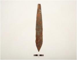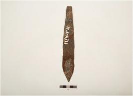 | Description / विवरण | A spearhead made on iron, pointed at one end, flat other end, long body rusted surface, rectangular in section. |