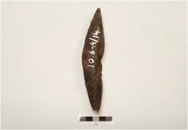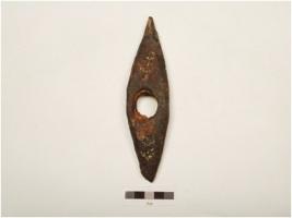 | Description / विवरण | A pick made on iron with central shaft hole, pointed at both ends, rusted surface, rectangular in section. |