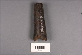 | Description / विवरण | Fragment of spear point, head is missing corroded surface. |