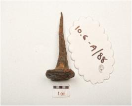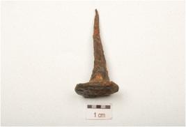 | Description / विवरण | Iron nail with cirucular flat head, rough surface with a pointed end, rusted, chemically treated and square in section. |