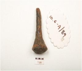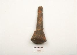| Description / विवरण | Iron nail with expanded triangular head, smooth surface, broken pointed end, rusted and circular in section. |