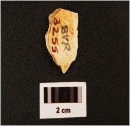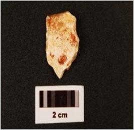 | Description / विवरण | A chert flake with flake scars on dorsal, use wear marks on edge and diffused bulb on ventral. |